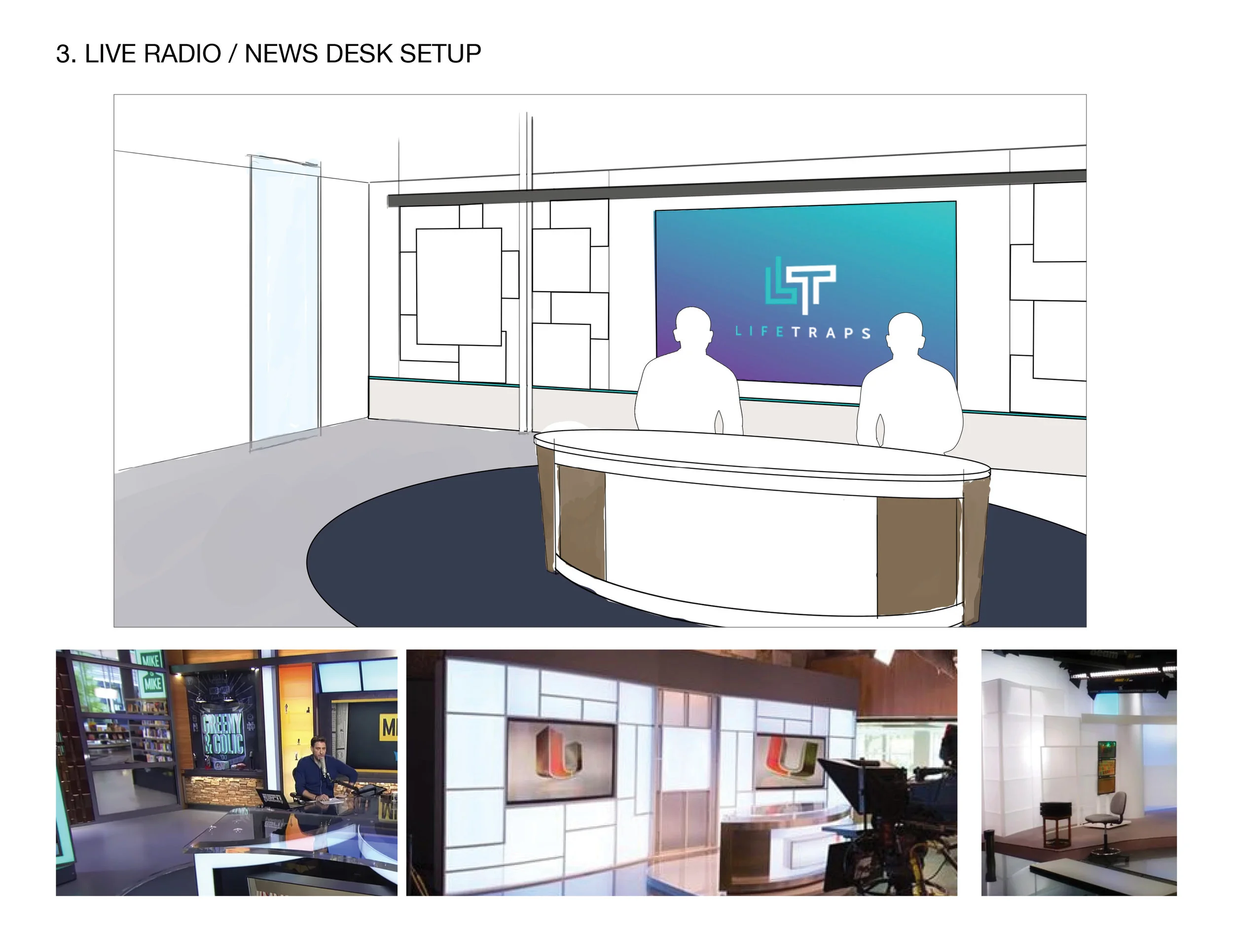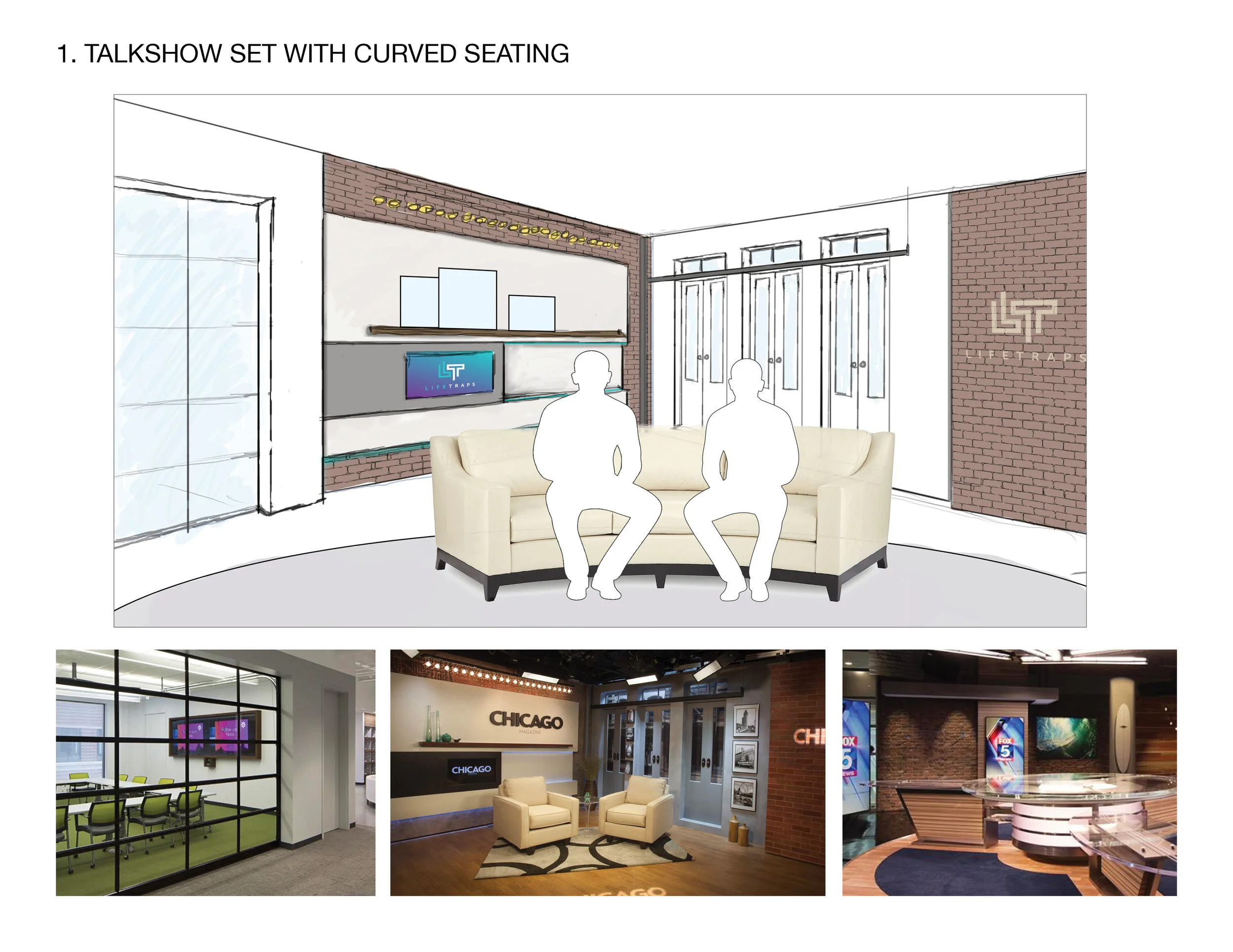 Worked with virtual developer as Set Designer to help communicate design needs by utilizing drawn set concepts and curated examples to clearly communicate brand vision. These sets are being produced for state-of-the-art 4K virtual set technology utilizing Unreal Engine and InfinitySet.