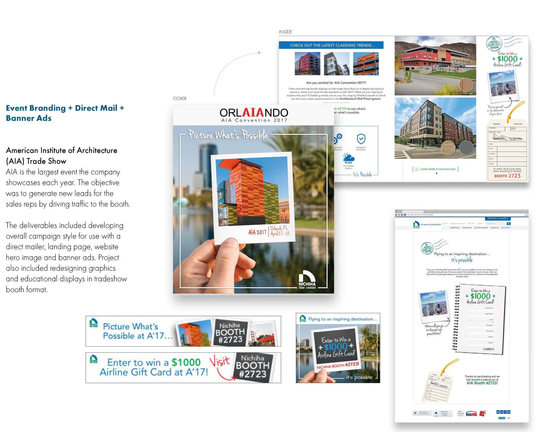 Trade show AIA is the largest event the company showcases each year. The objective is to generate new leads for the sales reps by driving traffic to the booth. The objective for the campaign included developing overall campaign style for use with a direct mailer, landing page, website hero image and banner ads. Project also included redesigning graphics and educational displays in 20x20 tradeshow booth format.
