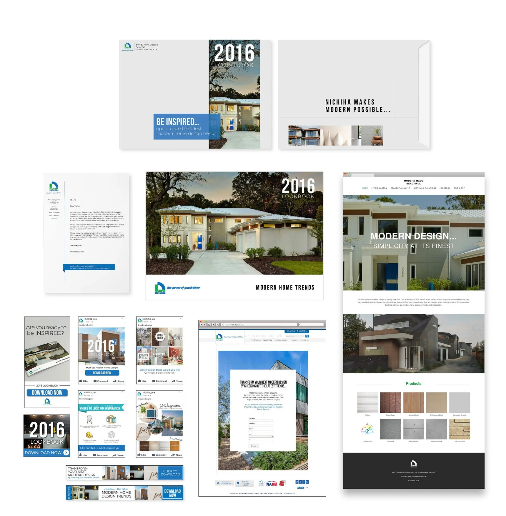 Modern Homes Campaign Campaign targets custom home builders and architects. The strategy was to design and market a lookbook showcasing the latest in modern home designs. All homes shown featured modern materials manufactured by the company. The objectives included campaign design for direct mailers, letterhead, a microsite, a splash landing page, banner ads, print ads and social media posts.